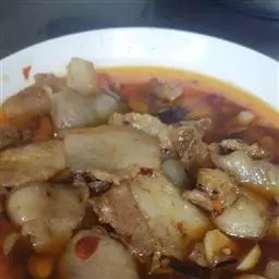 2、待汤再烧开后,盖上锅盖,移在微火上煮到肉烂为止。然后将肉捞出,盛在盘内,蘸着调料汁吃。