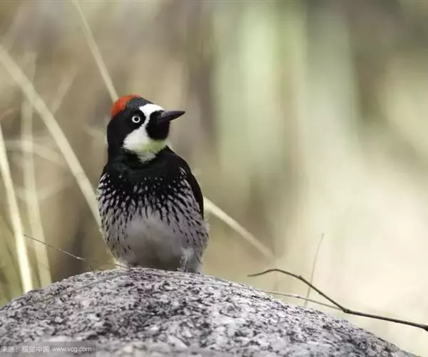 橡树啄木鸟:体长20-23厘米。前额灰黄色,头顶、后颈红色。喉下部、腰和腹部白色,…