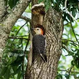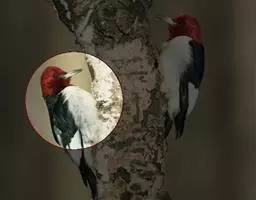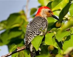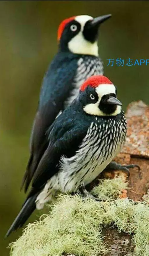 橡树啄木鸟(学名:Melanerpes formicivorus):体长20-23厘米。前额灰黄色,头顶、后颈红色。喉下部、腰和腹部白色,腹部有细的黑色纵条纹。其余体羽为黑色。嘴黑色。腿、脚暗灰色。