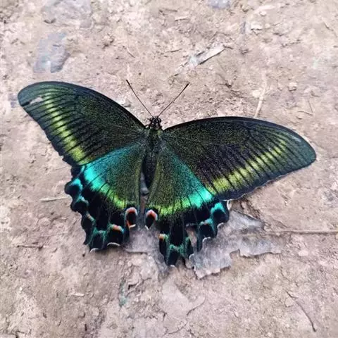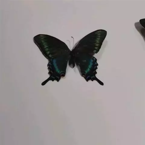 蓝凤蝶,Papilio protenor Cramer,凤蝶科凤蝶属的一种昆虫。翅展95~120mm。翅黑色,有靛蓝色天鹅绒光泽。雄蝶后翅正面前缘有黄白色斑纹,臀角有外围红环的黑斑;后翅反面外缘有几个弧形红斑,臀角具3个红斑。中国有3亚种。