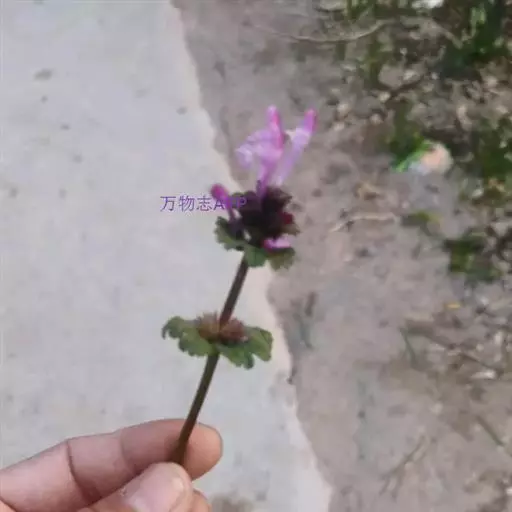一年生或二年生植物。茎高10-30厘米,基部多分枝,上升,四棱形,具浅槽,常为深蓝色,几无毛,中空。茎下部叶具长柄,柄与叶片等长或超过之,上部叶无柄,叶片均圆形或肾形,长1-2厘米,宽0.7-1.5厘米,先端圆,基部截形或截状阔楔形,半抱茎,边缘具极深的圆齿,顶部的齿通常较其余的为大,上面暗橄榄绿色,下面稍淡,两面均疏生小糙伏毛。轮伞花序6-10花,其中常有闭花授精的花;苞片披针状钻形,长约4毫米,宽约0.3毫米,具缘毛。花萼管状钟形,长4-5毫米,宽1.7-2毫米,外面密被白色直伸的长柔毛,内面除萼上被白色直伸长柔毛外,余部无毛,萼齿5,披针状锥形,长1.5-2毫米,边缘具缘毛。花冠紫红或粉红色,长1.7厘米,外面除上唇被有较密带紫红色的短柔毛外,余部均被微柔毛,内面无毛环,冠筒细长,长约1.3厘米,直径约1毫米,筒口宽约3毫米,冠檐二唇形,上唇直伸,长圆形,长约4毫米,先端微弯,下唇稍长,3裂,中裂片倒心形,先端深凹,基部收缩,侧裂片浅圆裂片状。雄蕊花丝无毛,花药被长硬毛。花柱丝状,先端不相等2浅裂。花盘杯状,具圆齿。子房无毛。小坚果倒卵圆形,具三棱,先端近截状,基部收缩,长约2毫米,宽约1毫米,淡灰黄色,表面有白色大疣状突起。花期3-5月,果期7-8月。 [1-2]