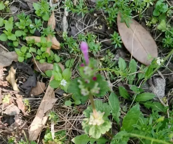 宝盖草(学名:Lamium amplexicaule L.)又名:珍珠莲、接骨草、莲台夏枯草等,属管状花目,唇形科一年生或二年生植物。茎高10-30厘米,基部多分枝,常为深蓝色。茎下部叶具长柄,柄与叶片等长或超过之,叶片均圆形或肾形,基部截形或截状阔楔形,半抱茎,边缘具极深的圆齿,花期3-5月,果期7-8月。
