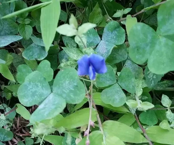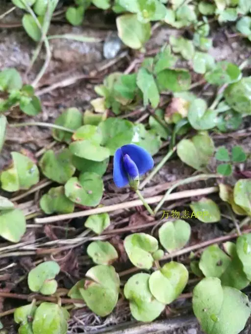 匍匐草本,高10-20厘米,被稀疏柔毛。根茎丝状,节上生根,有根瘤。掌状三出复叶;托叶阔披针状卵形,长4-5毫米,膜质,无毛,全缘;叶柄细柔,长达8-15厘米,微被细柔毛;小叶倒心形,长8-20毫米,宽10-20毫米,基部狭楔形,边全缘,或有时呈波状浅圆齿,上面无毛,下面被贴伏柔毛,侧脉4-5对,达叶缘处分叉并环结,细脉网状,不明显,两面均平坦;小叶柄甚短,长约1毫米。伞状花序生于叶腋,具花1-3朵;总花梗与叶柄等长;苞片2-4枚;花长约2厘米;花梗长5-10毫米,被柔毛;萼钟形,长6-9毫米,密被褐色细毛,萼齿三角形,与萼筒等长或稍短;花冠淡蓝色至蓝紫色,偶为白色和淡红色,旗瓣阔倒卵形,先端凹陷,基部狭至瓣柄,无毛,脉纹明显,翼瓣长圆状镰形,先端钝,基部有耳,稍短于旗瓣,龙骨瓣比翼瓣稍短,三角状阔镰形,先端成直角弯曲,并具急尖,基部具长瓣柄;子房线状披针形,无毛,胚珠多数,上部渐狭至花柱,花柱向上弯曲,稍短于子房。荚果线形,无毛,长20-25毫米,宽3-4毫米,先端斜截尖,有种子8-12粒。种子肾形,棕色,有时具斑纹,长2毫米,厚约1毫米,种脐小,圆形,侧生。花果期4-11月 。