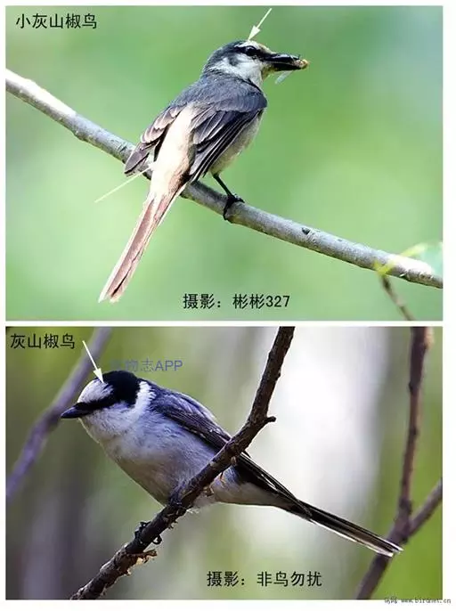 灰山椒鸟外形、大小和小灰山椒鸟基本相似,体长18-20厘米。上体灰色或石板灰色,两翅和尾黑色,翅上具斜行白色翼斑,外侧尾羽先端白色。前额、头顶前部、颈侧和下体均白色,具黑色贯眼纹。雄鸟头顶后部至后颈黑色,雌鸟头顶后部和上体均为灰色。 小灰山椒鸟和该种很相似,野外容易混淆,但小灰山椒体型稍小,腰和尾上覆羽沙褐色,与背不同色。另外小灰山椒鸟上体亦较暗,下体胸和体侧沾有褐灰色。此外,小灰山椒嘴基黑色细窄,不与眼先黑色相连,即使相连,连结处亦甚狭窄,而该种额基与眼先黑色相连,形成‘ㄩ’形状。