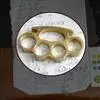 3、一手抓墨鱼胶,从拇指虎口处挤出小团,另一手使汤匙将鱼胶刮下,放进生油中浸脱,双手连贯动作,至刮完鱼胶丸为止。