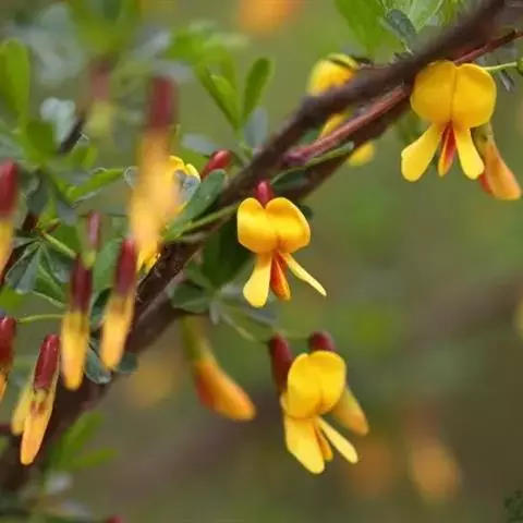柠条锦鸡儿(学名:Caragana korshinskii Kom.)是豆科锦鸡儿属植物,灌木,有时小乔状,高1-4米;老枝金黄色,有光泽;嫩枝被白色柔毛。羽状复叶有6-8对小叶;托叶宿存;叶轴脱落;小叶披针形或狭长圆形,先端锐尖或稍钝,有刺尖,灰绿色。花梗密被柔毛,关节在中上部;花萼管状钟形,密被伏贴短柔毛,萼齿三角形或披针状三角形;花冠旗瓣宽卵形或近圆形,稍短于瓣片,耳短小,耳极短;子房披针形,无毛。荚果扁,披针形,有时被疏柔毛。花期5月,果期6月。