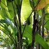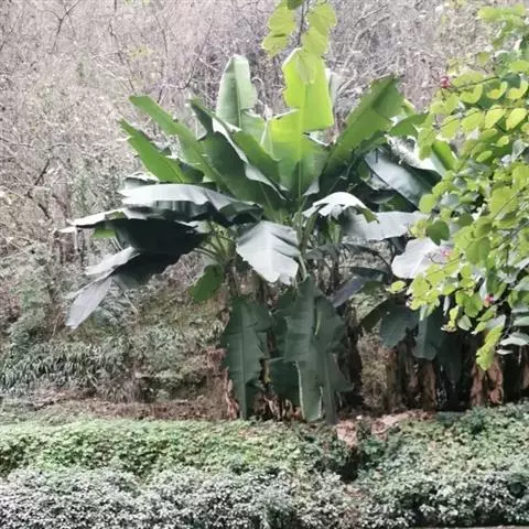 外形艳丽的是苞片,真正的花是躲于长圆形苞片的保 版纳热带花卉园中的紫苞芭蕉 护下,直到授粉才暴露出来的黄色小花。当下部的苞片向外反折时,可见到排成一行的雌花3—5朵,异化的萼片位于小香蕉状的子房上方。雄花也是3—5朵排成一行,但着生于顶端的苞片内,且晚些成熟,苞片叠瓦状或顶端微卷。果实状如指头,长6—8cm,种子黑色,但不可食。当果实成熟后,假茎会死亡凋零,新叶芽会从根茎处重新长出。