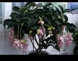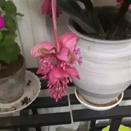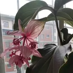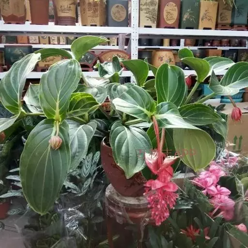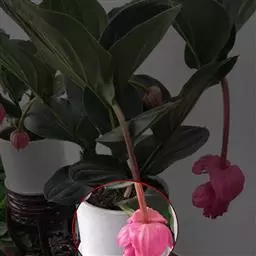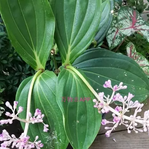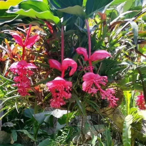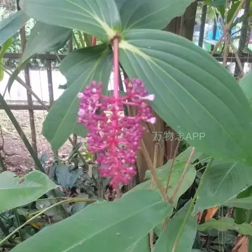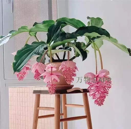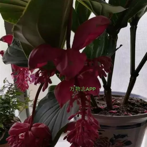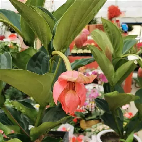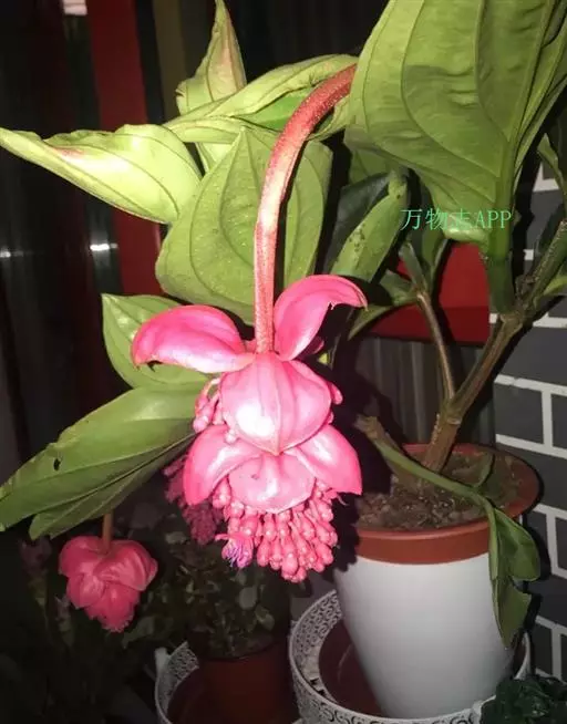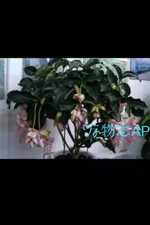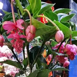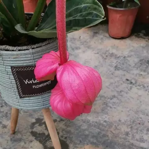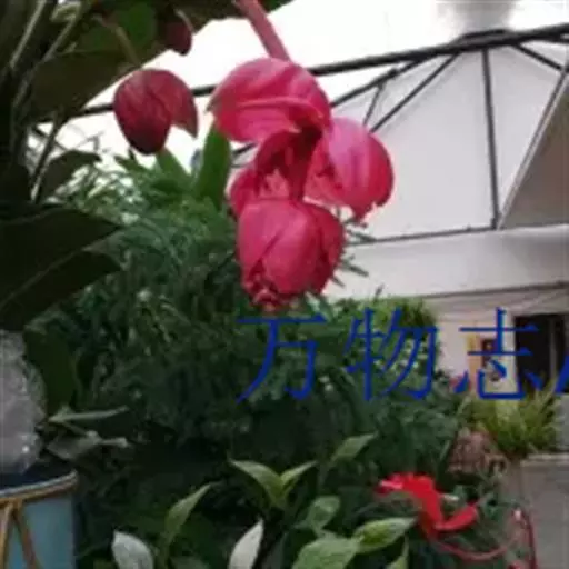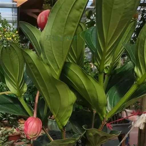 粉苞酸脚杆(学名:Medinilla magnifica Lindl. )是野牡丹科,酸脚杆属常绿小灌木,宝莲灯茎较短而粗壮,叶形类似柑橘,互生。植株多分枝,花茎从叶腋处抽出,硕大的花蕾类似倒挂的灯笼,开花时的花瓣类似倒开的荷花,花茎顶端和花瓣处挂满类似珍珠宝石的小球,故名宝莲灯花。花色有浅粉色和粉红色。花期为2月至8月,花开时间可长达百天以上。