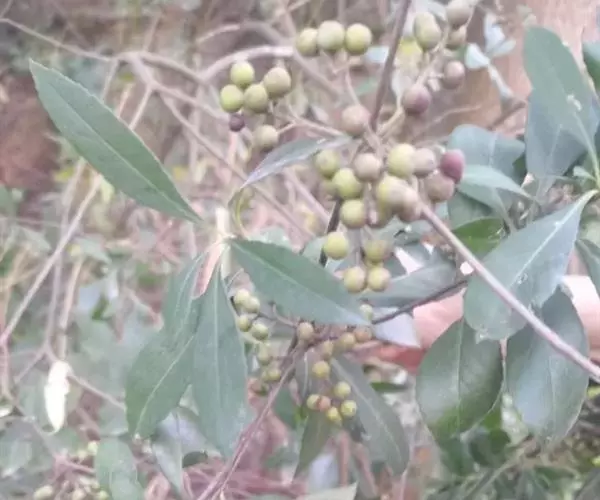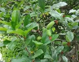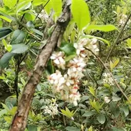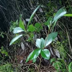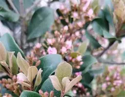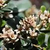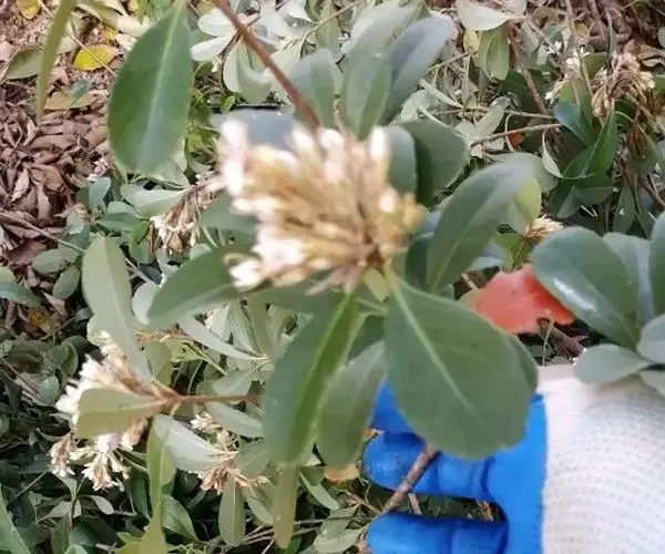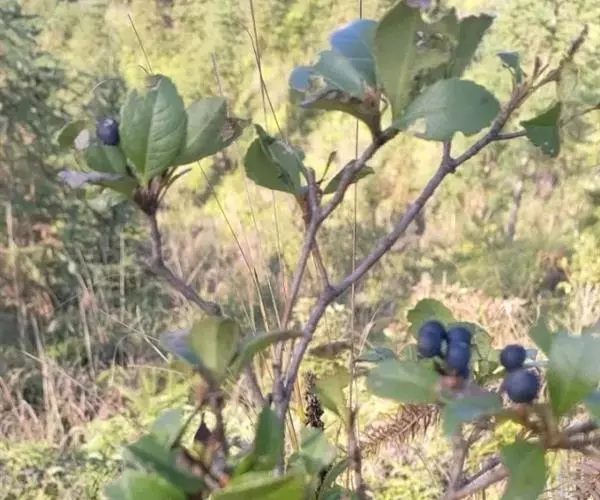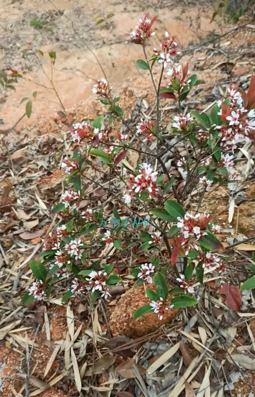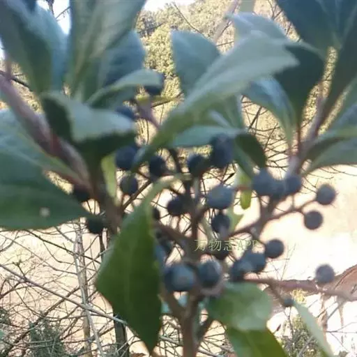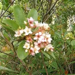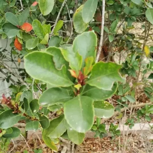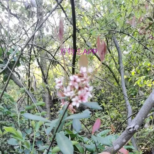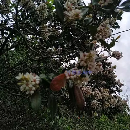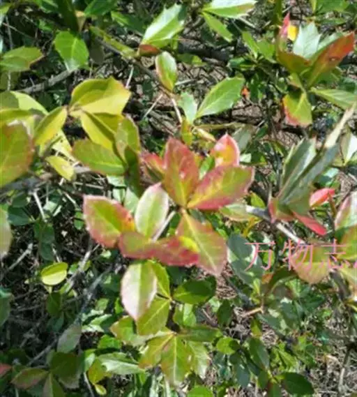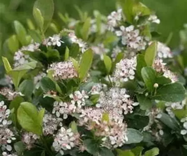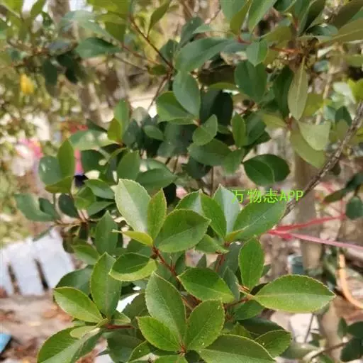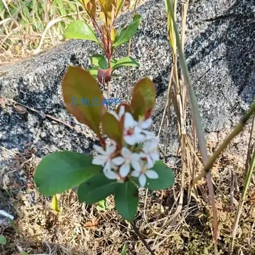 【植物形态】:植物形态:常绿灌木,高可达3米。树皮暗紫褐色或暗灰色,小枝紫棕色,光滑无毛。叶互生,革质,长椭圆或倒卵至倒卵状披针形,长约3.5~8厘米,宽1.5~3.5厘米,先端钝或短渐尖,基部楔形并下延于叶柄,表面暗绿色,背面淡绿色或苍白色,两面无毛,主脉于下面隆起,边缘向下卷,具疏锯齿。花白色带红晕,顶生总状花序或短圆锥花序,花萼5裂,花冠5瓣,雄蕊15枚左右,子房下位,2室。果为梨果状,球形,熟时蓝黑色。