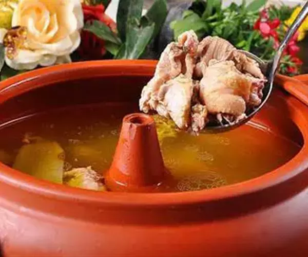 汽锅鸡 蒸汽锅鸡的餐具要用建水的土陶汽锅味道才正。建水汽锅外形古朴,构造独特,肚膛扁圆,正中立有一根空心管,蒸汽沿此管进入锅膛,经过汽锅盖冷却后变成水滴入锅内,成为鸡汤。两三个小时后,肉粑骨离,便可食用,鸡块鲜嫩,汤汁甜美。