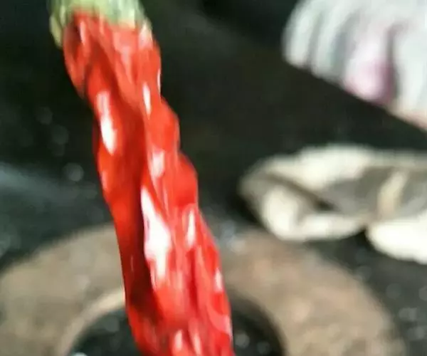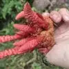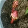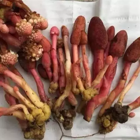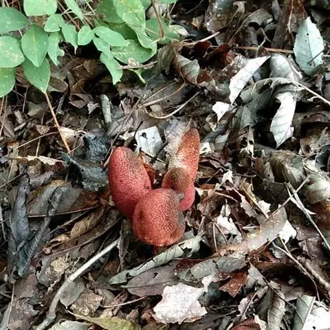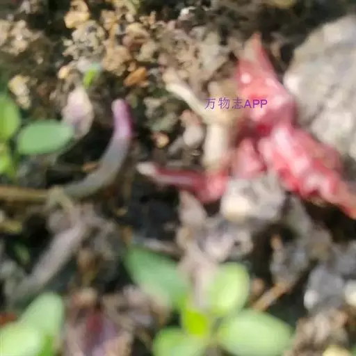 草本,高10-20厘米,全株鲜红色至暗红色,有时转紫红色;根茎分枝,分枝近球形,长1-3厘米,宽1-2.5厘米,表面密被粗糙小斑点和明显淡黄白色星芒状皮孔;花茎长5-10厘米;鳞苞片椭圆状长圆形,顶端钝,互生,8-14枚,长2-2.5厘米,宽1-1.5厘米,基部几全包着花茎。花雌雄异株(序);雄花序圆柱状,长3-18厘米,宽0.5-2厘米,顶端渐尖;雄花近辐射对称,疏生于雄花序上,花被裂片通常5(有时4或6),近圆形,长2-3毫米,顶端尖或稍钝圆;聚药雄蕊近圆盘状,有时向两侧稍延展,中部呈脐状突起,直径4.5-6毫米,花药5枚,小药室10;无梗或近无梗;雌花序卵圆形至长圆状椭圆形,向顶端渐尖,长2-6厘米,宽0.8-2厘米;子房卵圆形,宽约0.5毫米,具细长的花柱和具短子房柄,聚生于附属体的基部附近;附属体棍棒状或倒圆锥尖状,顶端截平或顶端中部稍隆起,中部以下骤狭呈针尖状,长约1毫米。花期9-11月。