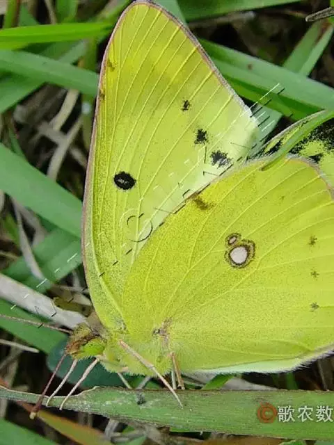 纹黄蝶,翅面黄色,缘毛桃红色;前翅外缘宽的黑边中有几个黄色斑,中室端部有一个黑斑;后翅外缘的黑色斑…