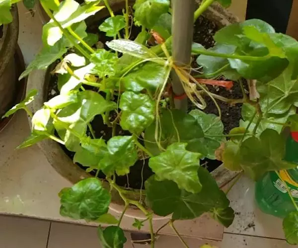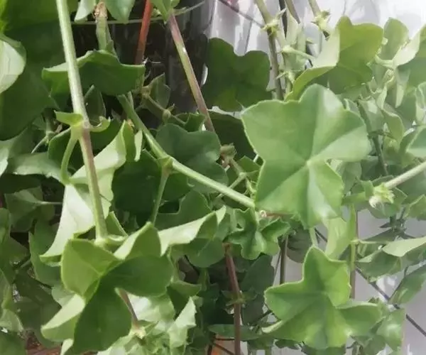 多年生攀缘或缠绕草本,长40-100厘米。茎粗3-10毫米,具棱角,多分枝,光滑或几无毛。叶互生,略呈肉质;托叶大,三角状心形,叶柄插生于叶缘以内;叶片近圆形,直径5-7厘米,五角状浅裂或有时近全缘,裂片宽三角形,先端微钝,边缘被睫毛。伞房花序腋生,有花数朵,总花梗和花梗被柔毛;花梗长6-10毫米,被柔毛,位于萼距之下;萼片披针形,长约1厘米,光滑或略被长柔毛;花冠洋红色,上面2瓣着深色条纹(栽培的种类其花瓣通常为同一颜色),下面3瓣彼此分离。 [1-2]