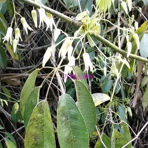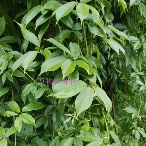木质藤本。茎绿色,具线纹,老茎皮厚,粗糙,浅灰褐色,纵裂。掌状复叶有小叶5-7片;叶柄长5-10厘米;小叶革质,长圆形、椭圆形或长圆状披针形,长6-9(11.5)厘米,宽2-4厘米,先端渐尖,基部钝、圆或楔形,边缘略加厚,上面深绿色,有光泽,下面浅绿色,嫩时常密布更线色的斑点;中脉在上面凹入,侧脉和网脉在两面均明显凸起;小叶柄长6-25毫米。花雌雄同株,通常3-4朵组成伞房花序式的总状花序;总花梗纤细,基部为大型的芽鳞片所包托;花梗长2-3厘米;苞片和小苞片线状披针形,长15-18毫米。雄花:萼片外面淡黄色或乳白色,内面紫红色,外轮的披针形,长约18毫米,宽约6毫米,内轮的线状披针形,长约16毫米,宽约3毫米;蜜腺状花瓣6枚,舌状,长约1.5毫米,顶端稍呈紫红色;花丝合生为管状,长约4毫米,花药长约3.5毫米,药隔突出所成之尖角状附属体与药室近等长,退化心皮小,锥尖。雌花:萼片与雄花的相似但稍大,外轮的长可达22-25毫米;退化雄蕊长约1毫米;心皮卵状棒形,柱头偏斜的头状;蜜腺状花瓣与雄花的相似。果长圆形,长7-10厘米,直径3-5厘米;种子近三角形,长约1厘米,压扁,种皮深褐色至近黑色,有光泽。花期3-4月,果期6-10月。
