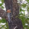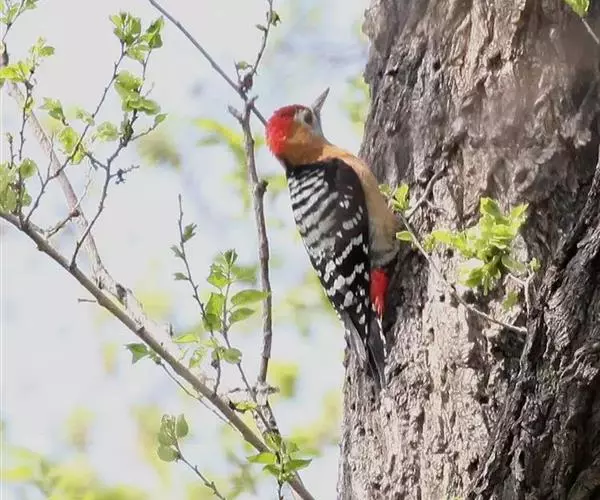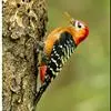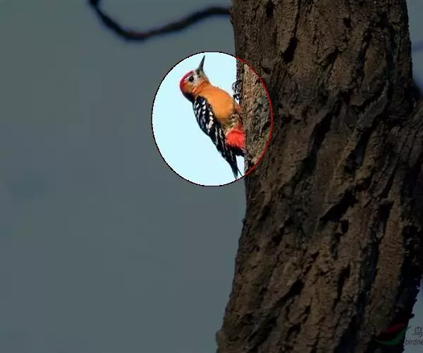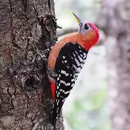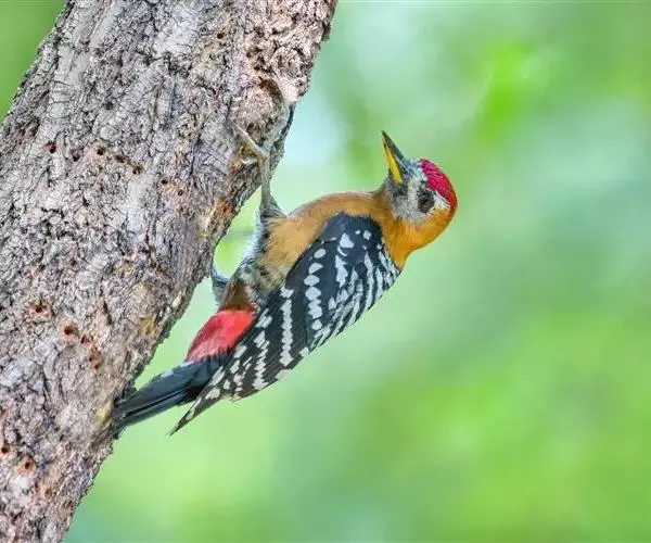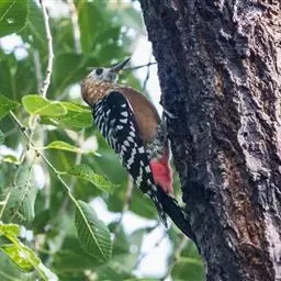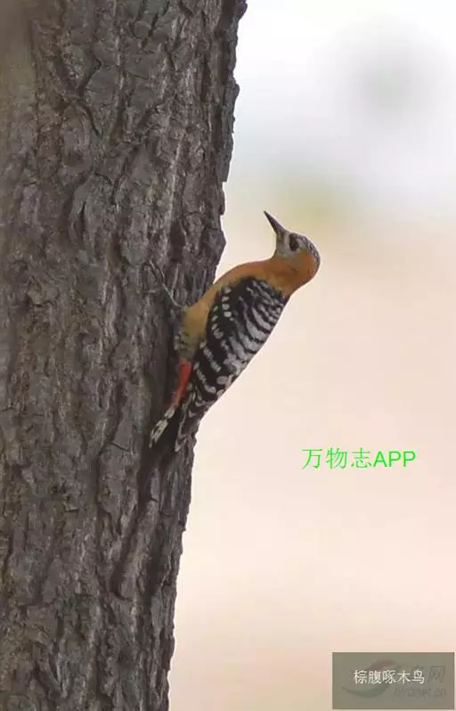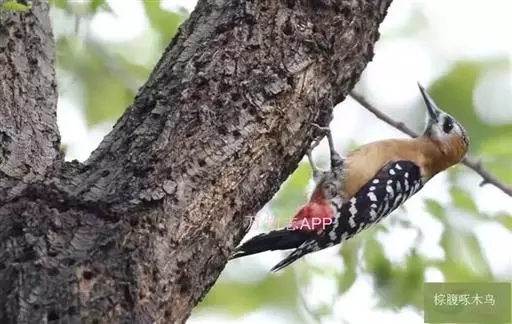 棕腹啄木鸟(学名:Dendrocopos hyperythrus)是中等体型的鸟类,体长约20厘米。头顶部具红色斑带。脚强健,有趾4个,其中2个向前,2个向后,各趾的趾端均具有锐利的爪,巧于攀登树木。尾羽的羽干刚硬如棘,能以其尖端撑在树干上,助脚支持体重并攀木。嘴强直如凿。舌细长,能伸缩自如,先端并列生短钩。攀木觅食时以嘴叩树。头骨十分坚固,大脑周围有一层绵状骨骼,内含液体,对外力能起缓冲和消震作用;能把喙尖和头部始终保持在一条直线上。錾树洞营巢,吃食昆虫,对防治林木害虫起到重要的作用,被称为“森林医生”