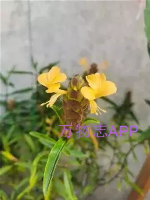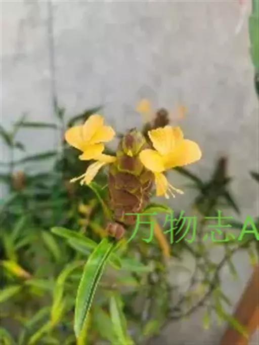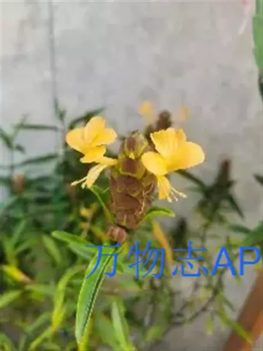 花密集着生于短枝上的苞腋,花序穗状;长枝及短枝基部的苞片为缩小的叶状,腋内着生1朵花,小苞片变成叉开的硬刺,向上逐渐变狭,苞片线状,长约10毫米,不再成刺;在正常叶腋着生的花的小苞片也变为叉开的硬刺,花果脱落后仍宿存;大花萼裂片卵形,先端渐尖,具软骨质尖刺,长14毫米,内面的略短,长13毫米,小萼狭卵形,长13毫米,先端渐尖;花冠黄色,长约2.4厘米,花冠管略短于喉部,下唇中裂片略宽而短,长8毫米,宽7毫米,两侧裂片与上唇裂近相等,长10毫米,宽6毫米;大雄蕊花药长3.2毫米,花丝长11毫米,小雄蕊花药长约1毫米,花丝长1.5毫米,均着生于喉基部;子房卵形,花柱线状,柱头略膨大,稍2裂,外露。蒴果卵形,长18毫米,径2.5毫米,先端渐尖成一实心的喙,内有种子2。