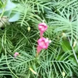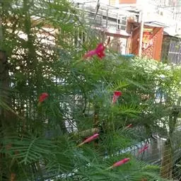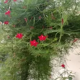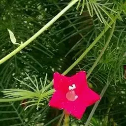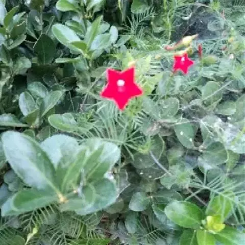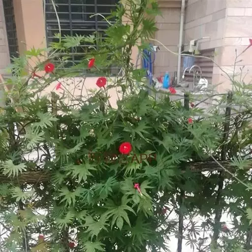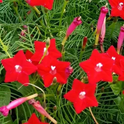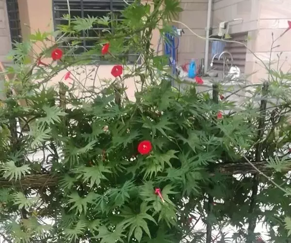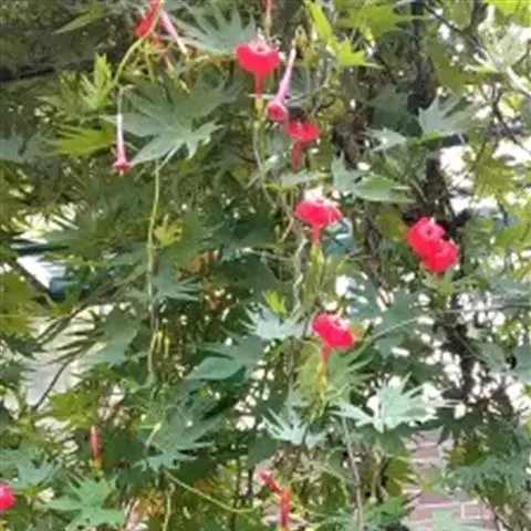 葵叶茑萝,为一年生缠绕草本。单叶互生,羽状深裂,裂片线形,细长如丝。聚伞花序腋生,着花数朵,花从叶腋下生出,花梗长约寸余,上着数朵五角星状小花,花高脚碟状,鲜红色或白色,花冠五浅裂,花冠边平展,花瓣五裂,整个花形远看似五角星,花冠红色,有白色及粉红色变种。