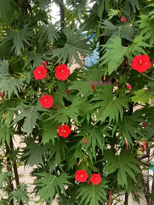 葵叶茑萝为旋花科的一种一年生蔓生草本。茎细长达数尺,其茎卷绕他物。叶掌状深裂端尖。夏月叶腋抽花轴,缀以数花,花冠长筒形,合瓣浅裂,色赤亦有白,雄蕊五枚,雌蕊一枚 ,秋后结子色黑。蒴果卵圆形,果熟期不一致。种子黑色,长卵形,有棕色细毛。花期7月至10月。茑萝的细长光滑的蔓生茎,长可达4-5米,柔软,极富攀援性,是理想的绿篱植物。它清晨开花,太阳落山后,花瓣便向里卷起,成苞状。它是一种细致可爱的植物,叶片纤细,似羽毛一样轻盈。每天开放一批,晨开午后即蔫。