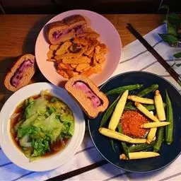 2、备菜:菜洗净,去根、皮;肉类宜切大片、薄片;午餐肉、火腿肠等切厚片;土豆等切厚片,分别装盘。