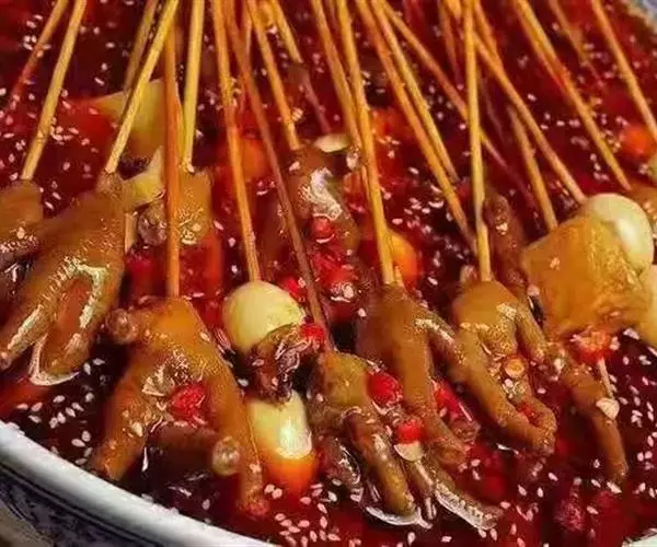 “串串香”最早是二十世纪八十年代中期,成都一些城镇待业人员为了生计,就在一些热闹的场所如商场、影剧院、录像厅等附近摆摊经营“串串香” 。以竹签串豆干、兔腰,在卤锅中烫熟,蘸上麻辣调料,“好吃嘴”们边走边吃,逍遥自在。风味浓郁、菜品丰富、服务优质,价廉消费而深受大众喜爱,食客络绎不绝。