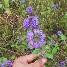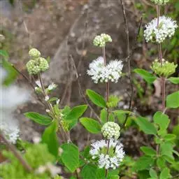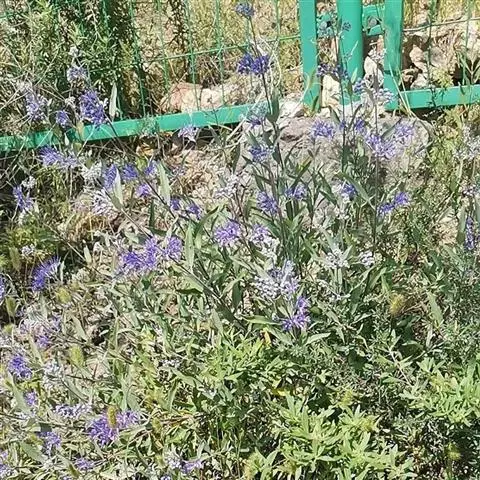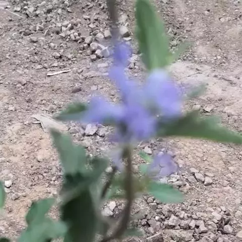 直立灌木,高25~60厘米,密被微毛。叶对生,具短柄,卵形或卵状矩圆形,长2~5厘米,先端钝,基部浑圆,边缘有粗锯齿,两面密披灰色短柔毛。聚伞花序,为具柄的花束,多花,长1~1.5厘米;萼钟形,长约2毫米,被微毛,5深裂,裂片披针形;花冠蓝色,管长约4毫米,5裂,有1裂片较大,边缘有睫毛,外面被微毛;雄蕊4,2长2短,伸出;花柱线形,两短裂。蒴果球形,外面被粗毛,分裂为4个凹陷的粟瓣,瓣缘内弯如翅,抱着种子。花期6~10月。