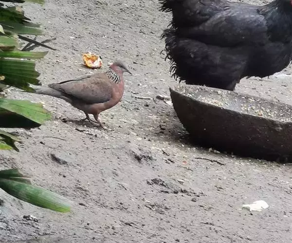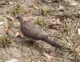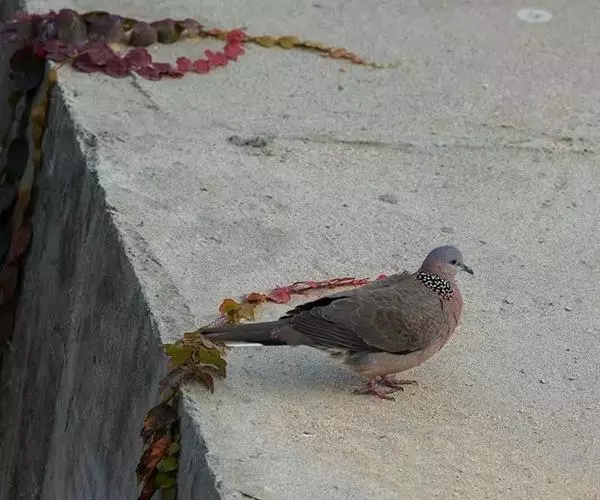 珠颈斑鸠(Streptopelia chinensis)是中国东部和南部最为常见的野生鸽形目鸟类,俗称“野鸽子”。体长30厘米左右,和鸽子大小相似。通体褐色,颈部至腹部略沾粉色。最引人注意的是它的颈部两侧为黑色,密布白色点斑,像许许多多的“珍珠”散落在颈部,为本种最为显著的特征,因而得名“珠颈”斑鸠。 不过这个珍珠斑点只有成年的珠颈斑鸠才有,幼鸟是没有的(此外,印度还有一个亚种也是没有“珍珠”的),且幼鸟的颜色也没有成鸟那样鲜艳。