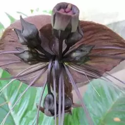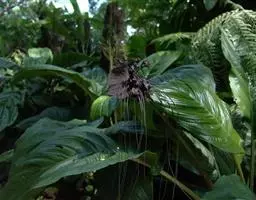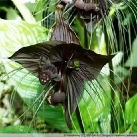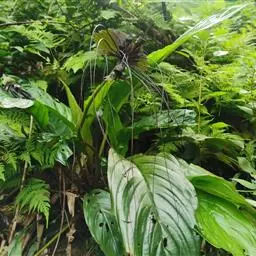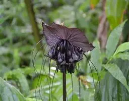 箭根薯,又名大叶屈头鸡《广西植物名录》,老虎花《中国高等植物图鉴》。多年生草本。根茎块状,环节明显,须根多数。叶基生,具长柄,柄长10-30cm,基部扩展成鞘状抱茎,肉质;叶片长椭圆形,长20-50cm,宽7-14cm,先端渐尖,基部楔形,下延,全缘,上面绿色,下面浅绿色,两面无毛;主脉粗壮向下突出,侧脉羽状平行。花葶从叶丛中抽出;总苞片4,暗紫色;数朵花簇生,排列成伞形花序状,常下垂;苞片线形,长约10cm;花被裂片6,紫褐色,内轮裂片较宽,先端具小尖头;雄蕊6,花丝顶部兜状,柱头弯曲成伞形,3裂,每裂片又2浅裂。浆果肉质,椭圆形,具6棱,成熟后紫褐色;种子肾形,长约3mm。花果期4-11月。