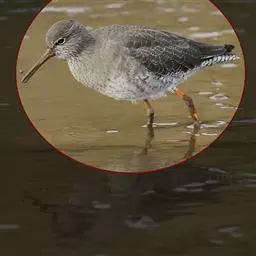 红脚鹬:体长28厘米,上体褐灰,下体白色,胸具褐色纵纹。飞行时腰部白色明显,次级飞羽具明显白色外缘。…