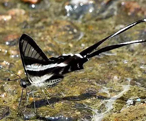 翅展40~45 mm。触角黑色。体背黑色,头宽,腹短。身体腹面苍白色。翅黑色;前翅中内区有1条灰白色带,端半部透明,脉纹十分清晰。后翅狭长,尾突特长,在凤蝶中是绝无仅有的,从前缘中部斜向尾突有1条灰白色带,但不到尾突时即终止,并与内缘中部发出的1条淡灰白色带汇合;外缘微波状,镶有白边直到尾突末端。雄蝶后翅臀褶内有白色长毛。翅反面前、后翅基部灰白色,其余与正面相似。