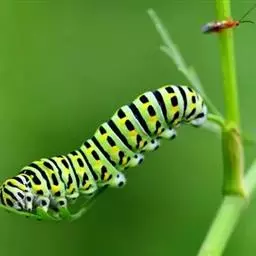 早期幼虫的胸部面是呈黑色的,胸部较窄,尾巴较宽。幼虫光滑。两则、头部的幼环及肛门部份都是黄赭色的。开始时头部是黑色的,在较后的时期会变为苹果绿色,背部较深,在第7至10节有3条幼长的黄带,在脚上由头至尾有一条浅黄色线。头部是绿色的,在顶部有四个黑圆点,和在口颌部份有两个较小的黑圆点。