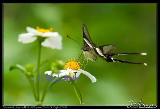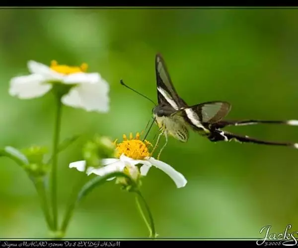头宽、胸粗、腹部不长于胸部。前翅直角形。后缘较外缘短,亚基部有一透明白带与后翅中区透明带(白色)相连;后翅窄而长,折叠成一个很长的尾,其端缘呈白色。雄和雌相似,仅雌在腹部腹面尾端前有一大的交配槽。分布区普遍,多发生在开阔林区接近有水的地方。常近地面急速飞翔,看起来似蜻蜓活动。喝水过多时.会从肛门有节奏地喷出水来。也常访花,但不停息其上.只是前翅急速振动而尾部抖动抬高.靠近花处原地停飞。 翅展:44—50mm。