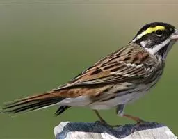 黄眉鹀是雀形目鹀科鹀属鸟类,体型中等偏小。雄鸟头部主要为黑色,冠纹白色,眉纹前段黄色而后段白色,…