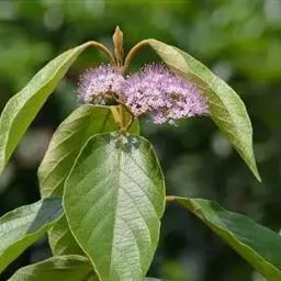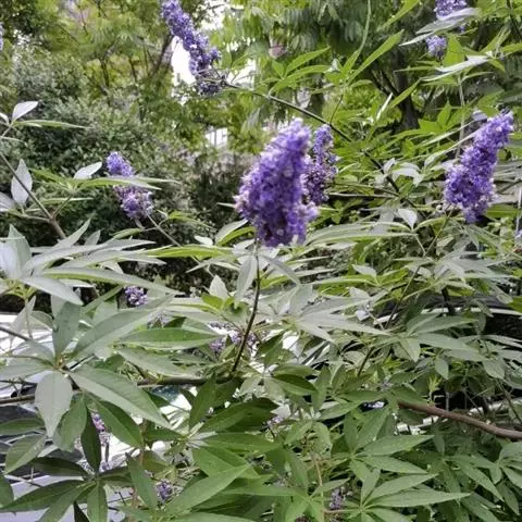 落叶灌木或小乔木,高可达2-8米,地径7-8厘米,树皮灰褐色,幼枝方形有四棱,老枝圆柱形,灰白色,被柔毛;掌状复叶对生或轮生,小叶5或3片,中间小叶最大且有明显短柄,两侧较小,长2-6厘米,叶缘呈大锯齿状或羽状深裂,上面深绿色具细毛,下面灰白色,密被柔毛。花序顶生或腋生,先由聚伞花序集成圆锥花序,长10-25厘米,花冠紫色或淡紫色,萼片宿存形成果苞,核果球形,果径2-5毫米,黑褐色,外被宿萼。花期6-8月,果期9-10月。