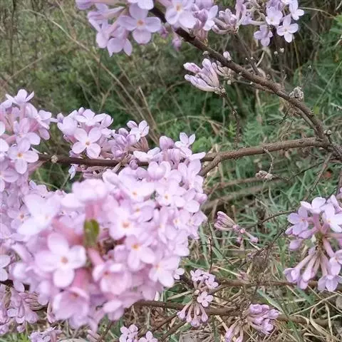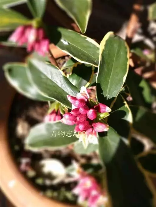 金边瑞香 常绿直立灌木;枝粗壮,通常二歧分枝,小枝近圆柱形,紫红色或紫褐色,无毛。呈顶生头花序,花被筒状,上端四裂径约1.5cm,每朵花由数十个小花组成,由外向内开放,花期二个多月,盛花期春节期间,花色紫红鲜艳,香味浓郁。