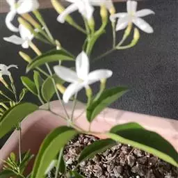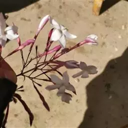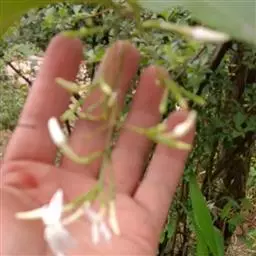 :圆锥花序顶生或腋生枝梢,长5-9厘米,疏被绒毛;花序梗扁平,长约1.5厘米,被细绒毛,渐秃净;花梗细,长约3毫米;雄花花萼小,杯状,萼齿尖三角形,花冠白色至淡黄色,裂片线形,长4-6毫米,雄蕊与裂片近等长,花药小,椭圆形,花丝细;两性花花萼较大,萼齿锥尖,花冠裂片长达8毫米,雄蕊明显短,雌蕊具短花柱,柱头2浅裂。