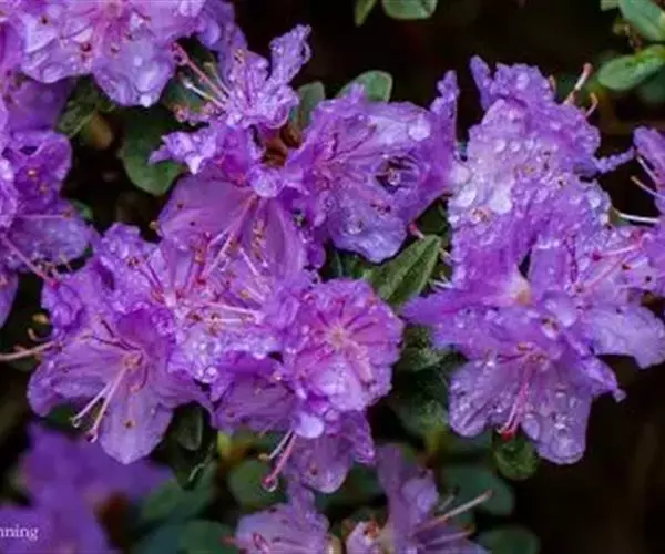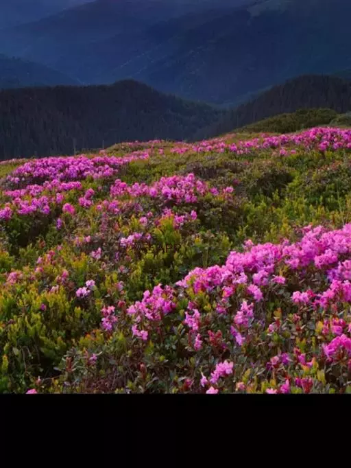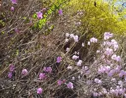 高山杜鹃(学名:Rhododendron lapponicum (L.) Wahl.):常绿小灌木,高可达1米,分枝繁密,伏地或挺直。叶常散生于枝条顶部,革质,上面浅灰至暗灰绿色,下面淡黄褐色至红褐色,叶柄被鳞片。花序顶生,伞形,有花数朵;花芽鳞脱落;花萼小,带红色或紫色,花冠宽漏斗状,淡紫蔷薇色至紫色,罕为白色,花丝基部被绵毛;蒴果长圆状卵形,5-7月开花,9-10月结果。