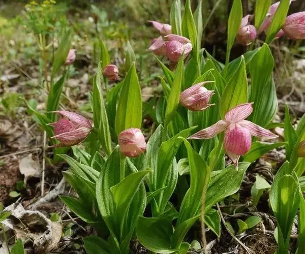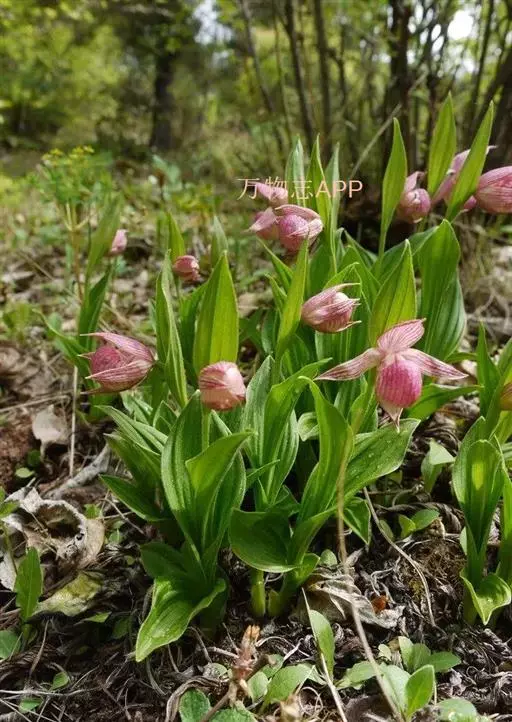 云南杓兰(学名:Cypripedium yunnanense Franch.):植株高20-37厘米,具粗短的根状茎。茎直立,无毛或在上部近节处疏被短柔毛,基部具数枚鞘,鞘上方具3-4枚叶。叶片椭圆形或椭圆状披针形。花序顶生,具1花;花略小,粉红色、淡紫红色或偶见灰白色,有深色的脉纹,退化雄蕊白色并在中央具1条紫条纹;花瓣披针形,长2.2-3.2厘米,宽7-8毫米,先端渐尖,稍扭转或不扭转,内表面基部具毛;唇瓣深囊状,椭圆形。花期5月。