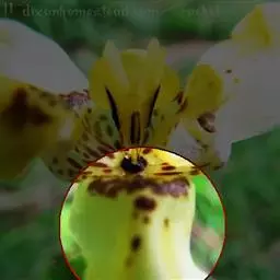 花瓣披针形,长2.2-3.2厘米,宽7-8毫米,先端渐尖,稍扭转或不扭转,内表面基部具毛;唇瓣深囊状,椭圆形,长2.2-3.2厘米,宽1.5-1.8厘米,囊口周围有浅色的圈,囊底有毛,外面无毛;退化雄蕊椭圆形或卵形,长6-7毫米,宽3-4毫米,基部近无柄。花期5月。