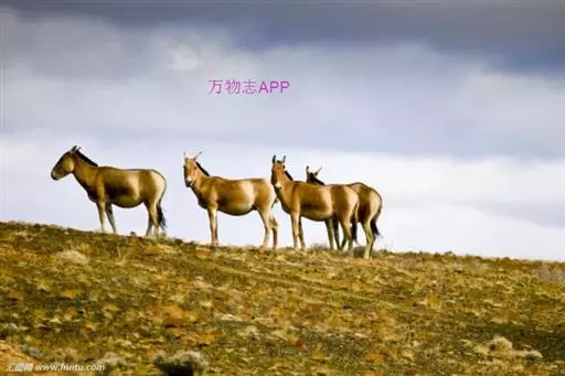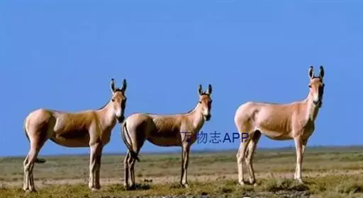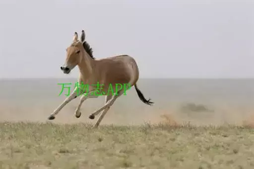 蒙古野驴(学名:Equus hemionus):外形似骡,体型介于家驴和家马之间,体长可达260厘米,肩高约120厘米,尾长80厘米左右,体重约250千克。吻部稍细长,耳长而尖。尾细长,尖端毛较长,棕黄色。颈背具短鬃,颈的背侧、肩部、背部为浅黄棕色,背中央有一条棕褐色的背线延伸到尾的基部,颈下、胸部、体侧、腹部黄白色,与背侧毛色无明显的分界线。