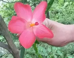 这种花有长达8—l2厘米的花柄;花呃萼小、杯状、质厚;花瓣长20—25厘米,宽2—3厘米,质如海绵状。厚达2—3毫米,外面淡黄,里面乳白,盛开时向外弯卷,雄蕊多数,长度超过20厘米,花丝的上、下以粉红和白色相间,非常雅致;花期6月。