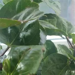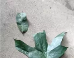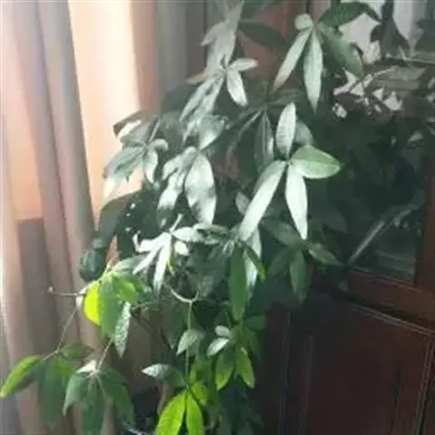 水瓜栗为掌状复叶,色彩墨绿,叶柄长10—25厘米,两端膨大成关节状;一片叶片中的小叶多为8枚,全缘,长l5—25厘米(—30厘米),先端宽为l0厘米左右,近基部渐狭,呈长倒卵形、倒卵状长椭圆形;小叶中部沿中脉下凹,状如小槽。叶的分布疏密度适中,采光和遮荫效果都好。