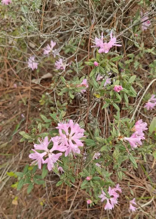 兴安杜鹃是杜鹃花科、杜鹃花属半常绿灌木,高可达2米,分枝多。叶片近革质,椭圆形或长圆形,…