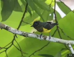 黄颊山雀是雀形目山雀科山雀属鸟类。雄鸟额、头顶和羽冠为具有光泽的黑色;额基、眼先、眉纹、脸颊和耳羽等头颈侧为鲜艳的明黄色;贯眼纹黑色;后颈亦具一黄斑;上体灰黄绿色,羽缘黑色;尾羽黑色具蓝灰色羽缘,基部白色;下体颏、喉至上胸为富有金属光泽的黑色;胸下有一黑色宽中央纵纹,一直延伸至肛周;其余下体白色;胸侧和两胁染黄色或蓝灰色;虹膜暗褐色;喙黑色;脚铅蓝灰色至铅黑色。雌鸟似雄鸟,但上体光泽较弱,胸腹部黑色纵带不明显。黄颊山雀分布于亚洲东南部地区,在中国分布于华中、华南和西南等地。栖息于中低山常绿阔叶林、针叶林和混交林中,也见于山麓疏林灌丛草坡或茶园、果园等地。常成对或小群活动,也和大山雀等其他小型鸟类混群,活跃地在乔灌木枝叶间飞翔跳跃。主食鳞翅目和鞘翅目等昆虫,兼食植物种实。繁殖期在4-6月,营巢于树洞、岩隙或墙缝中。窝卵数为3-7枚,卵灰白色且有红褐斑,雏鸟晚成。黄颊山雀被列入中国林业局200