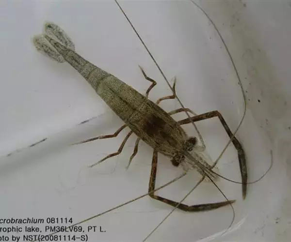 日本沼虾(学名:Macrobrachium nipponense)是长臂虾科、沼虾属鱼类。体形呈长圆筒形,成虾体长3-8厘米。体形粗短,分为头胸部与腹部两部分。头胸部比较粗大,往后渐次细小,腹部后半部显得更为狭小。头胸部各节愈合,头胸甲前端中央有一剑状突起称为额剑,其长度约为头胸甲的3/4-4/5,额剑尖锐、平直,上缘有12-15个齿,下缘有2-4个齿。身体由20个体节组成(头部5节、胸部8节、腹部7节)。胸部8对附肢,前3对为颚足。后5对称为步足,用来爬行、捕食或防御敌害。腹部6对附肢,前5对称为游泳足。体色呈青灰色并有棕色斑纹,由此而得名。体色常随栖息环境而变化,湖泊、水库、江河水色清、透明度大,虾色较浅,呈半透明状,池沼水质肥沃,透明度小,虾色深,并常有藻类附生于甲壳上。