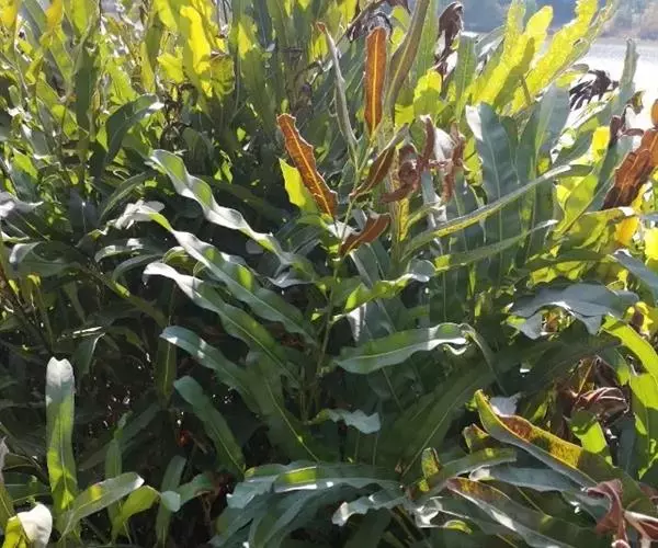 卤蕨(学名:Acrostichum aureum L.)是卤蕨科,卤蕨属植株高可达2米。根状茎直立。叶簇生,叶柄基部褐色,被钻状披针形鳞片,羽片多,基部一对对生,长舌状披针形,叶厚革质,干后黄绿色,光滑。孢子囊满布能育羽片下面,无盖。