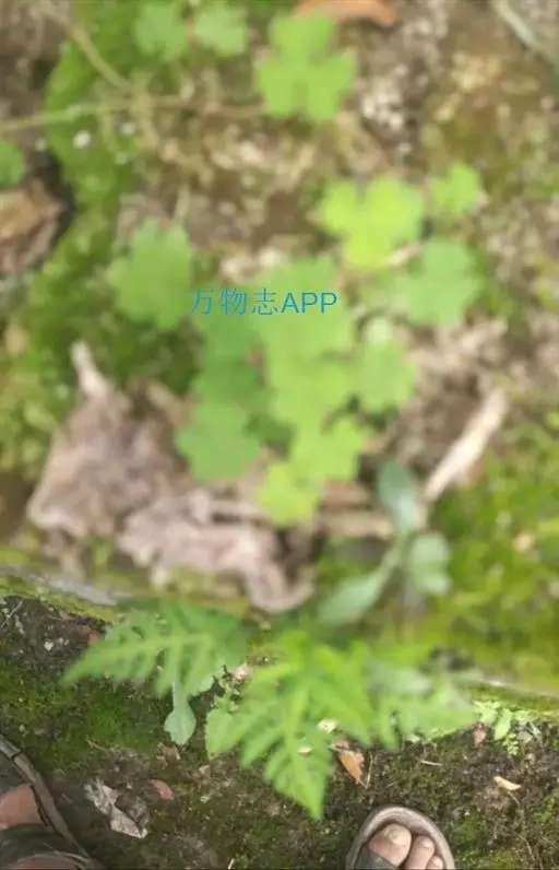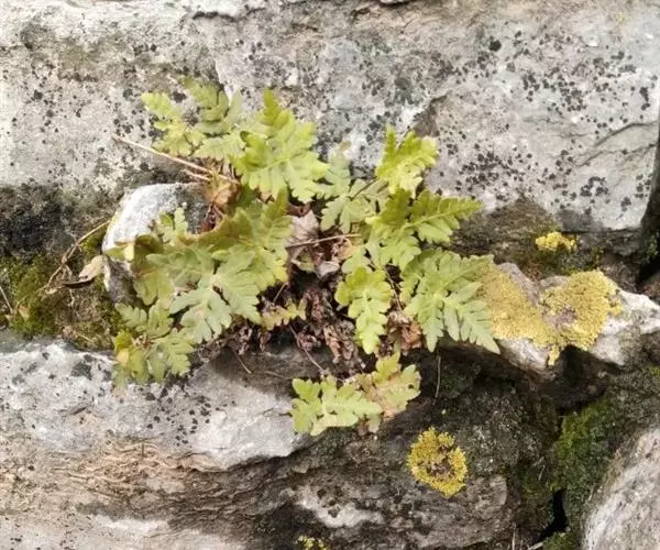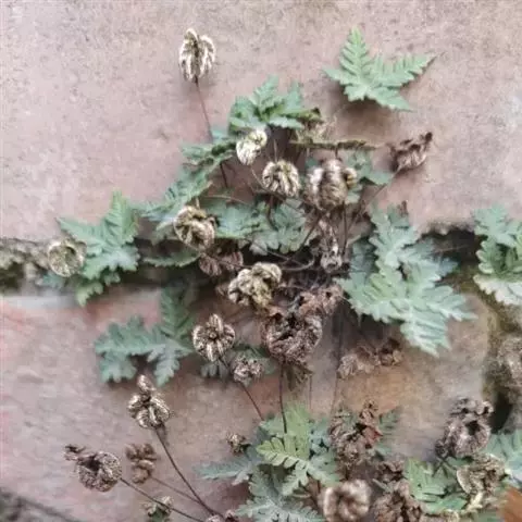 植株高15-30厘米。根状茎直立或斜升(偶有沿石缝横走)先端被披针形,棕色、有光泽的鳞片。叶簇生;叶柄长10-20厘米,粗约7毫米,红棕色、有光泽,上部光滑,基部疏被棕色披针形鳞片;叶片五角形,长宽几相等,约5-7厘米,先端渐尖,羽片3-5对,基部三回羽裂,中部二回羽裂,上部一回羽裂;基部一对羽片直角三角形,长3-5厘米,宽2-4厘米,水平开展或斜向上,基部上侧与叶轴合生,下侧不下延,小羽片3-4对,以圆缺刻分开,基部以狭翅相连,基部下侧一片最大,长2-2.5厘米,宽0.5-1厘米,长圆披针形,先端长渐尖,有裂片3-4对;裂片三角形或镰刀形,基部一对较短,羽轴上侧小羽片较短,不分裂,长仅1厘米左右;第二对羽片为不整齐的一回羽裂,披针形,基部下延成楔形,往往与基部一对羽片汇合,先端长渐尖,有不整齐的裂片3-4对;裂片三角形或镰刀形,以圆缺刻分开;自第二对羽片向上渐次缩短。叶干后草质或薄革质,上面褐色、光滑,叶脉不显,下面被乳白色或淡黄色粉末,裂片边缘有明显而均匀的细齿牙。孢子囊群较多;囊群盖连续,狭,膜质,黄绿色,全缘,孢子极面观为钝三角形,周壁表面具颗粒状纹饰。
