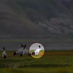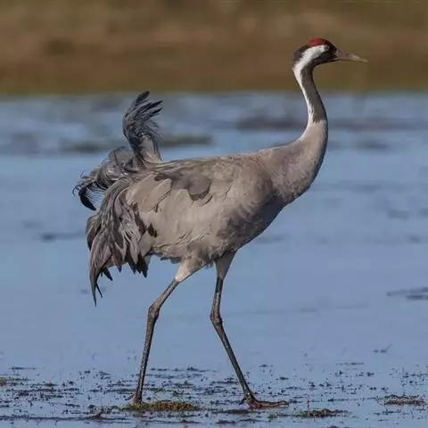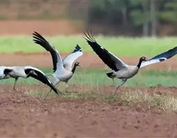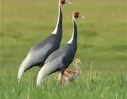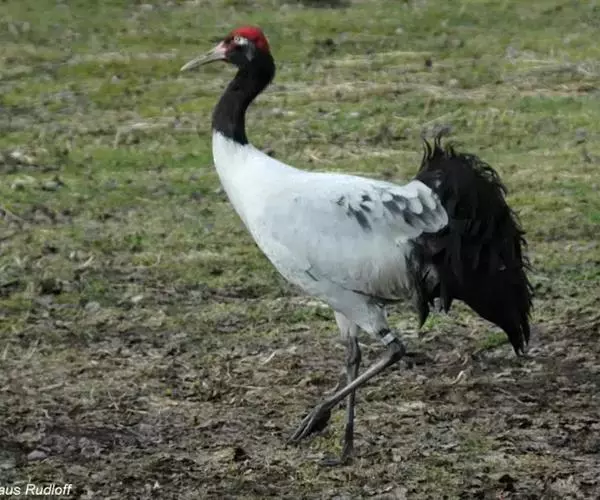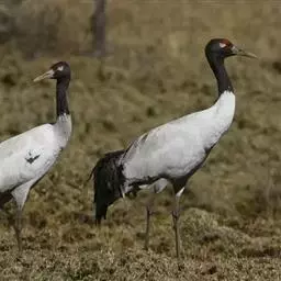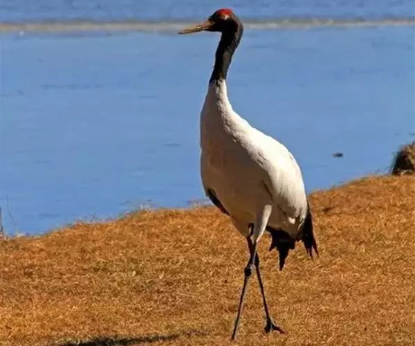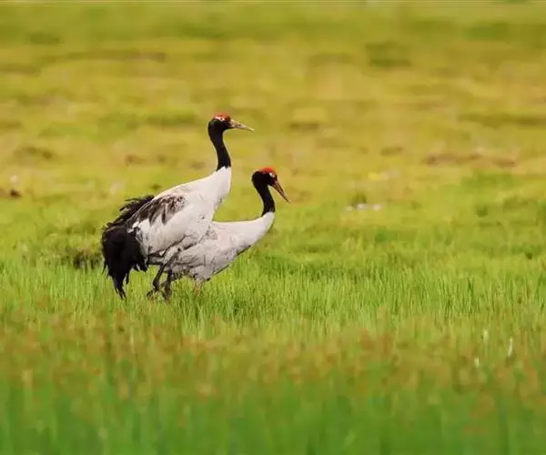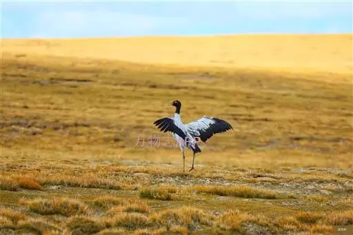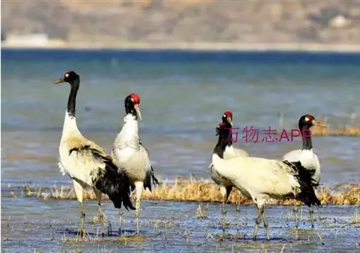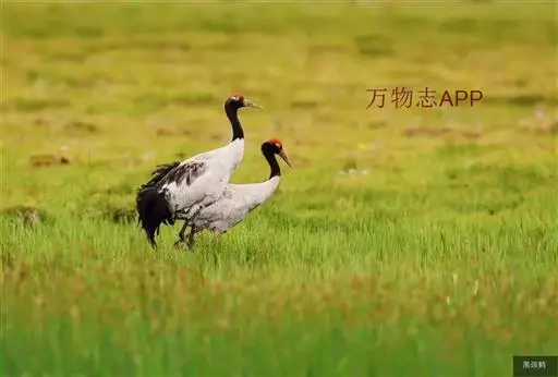 黑颈鹤(学名:Grus nigricollis):大型涉禽,体长110-120厘米,体重4-6千克。颈、脚甚长,通体羽毛灰白色,头部、前颈及飞羽黑色,眼先和头顶前方裸露的皮肤呈暗红色,尾羽褐黑色。头顶,三级飞羽的羽片分散,当翅闭合时超过初级飞羽。虹膜黄褐色,嘴肉红色,尖端沾黄,腿和脚灰褐色。