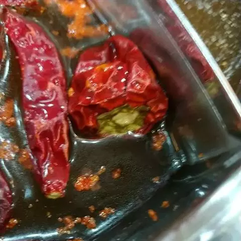 15.锅里放油,凉油的时候就放入花椒和辣椒圈,小火烧,注意看辣椒,变得红中微黄且油亮干酥,注意观察别熬过火了。