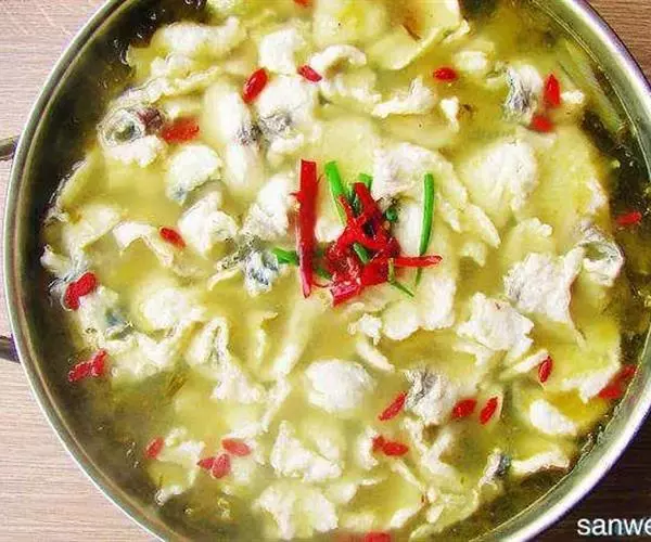 4酸菜鱼用鲜鱼加泡青菜制汤,因泡青菜味酸,故名。四川民间,初冬用青菜腌渍酸菜,大坛贮存,随用随取,可食至来年夏天。多以酸菜合鸡、鸭、鱼、肉做汤菜,酸鲜爽口,消暑解腻。