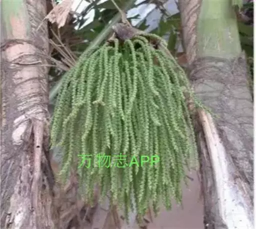 丛生,小乔木状,高5-8米,直径8-15厘米;茎绿色,表面被微白色的毡状绒毛。叶长3-4米,下部羽片小于上部羽片;羽片呈楔形或斜楔形,外缘笔直,内缘1/2以上弧曲成不规则的齿缺,且延伸成尾尖或短尖,淡绿色,幼叶较薄,老叶近革质;叶柄被褐黑色的毡状绒毛;叶鞘边缘具网状的棕黑色纤维。佛焰苞与花序被糠秕状鳞秕,花序短,长25-40厘米,具密集穗状的分枝花序;雄花萼片宽倒卵形,长约2.5毫米,宽4毫米,顶端全缘,具睫毛,花瓣狭长圆形,长约11毫米,宽2.5毫米,淡绿色,雄蕊15-20(-25)枚,几无花丝;雌花萼片宽倒卵形,长约为花瓣的1/3倍,顶端钝圆,花瓣卵状三角形,长3-4毫米;退化雄蕊3枚,长约为花瓣的1/2(-1/3)倍。果球形,直径1.2-1.5厘米,成熟时紫红色,具1颗种子。花期4-6月,果期8-11月。
